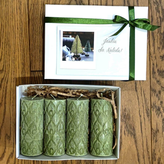 Kvepiančių Žvakių Rinkinys 4vnt. Žalia Spalva, Su Dovanų Dėžute Gaivus Santalo Kvapas