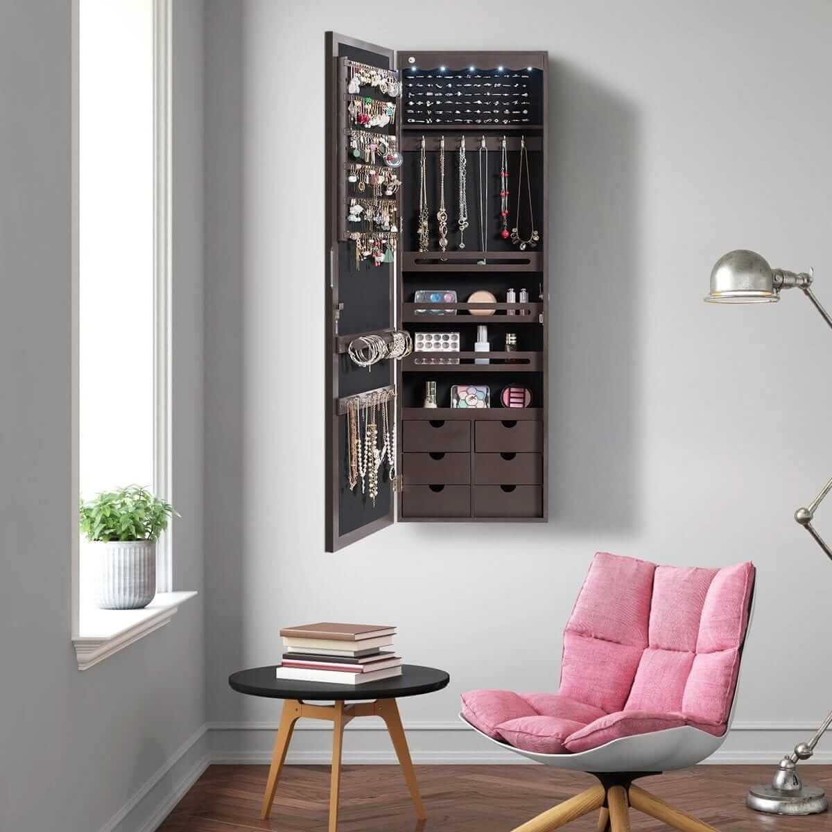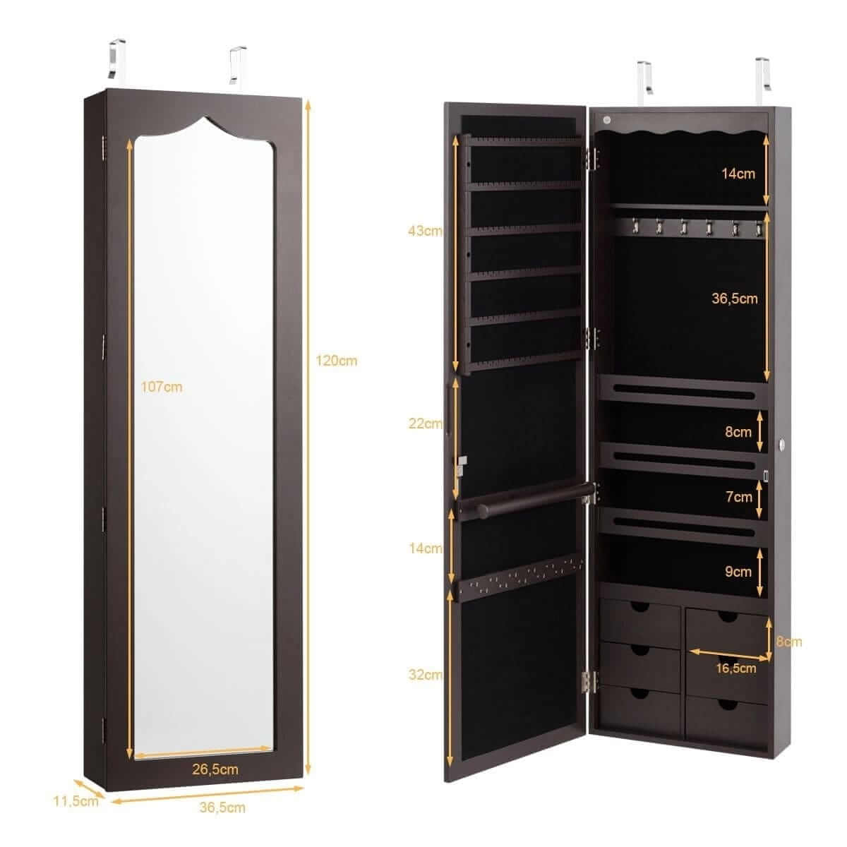The jewelry cabinet is made of high-quality MDF, so it is strong and durable. You can keep all your favorite accessories organized thanks to the built-in compartments and lock. The jewelry cabinet can be hung on the door with handles or screwed to the wall. In addition, 5 automatic lights will make the choice easier, and the full-length mirror will allow you to better appreciate your beauty.