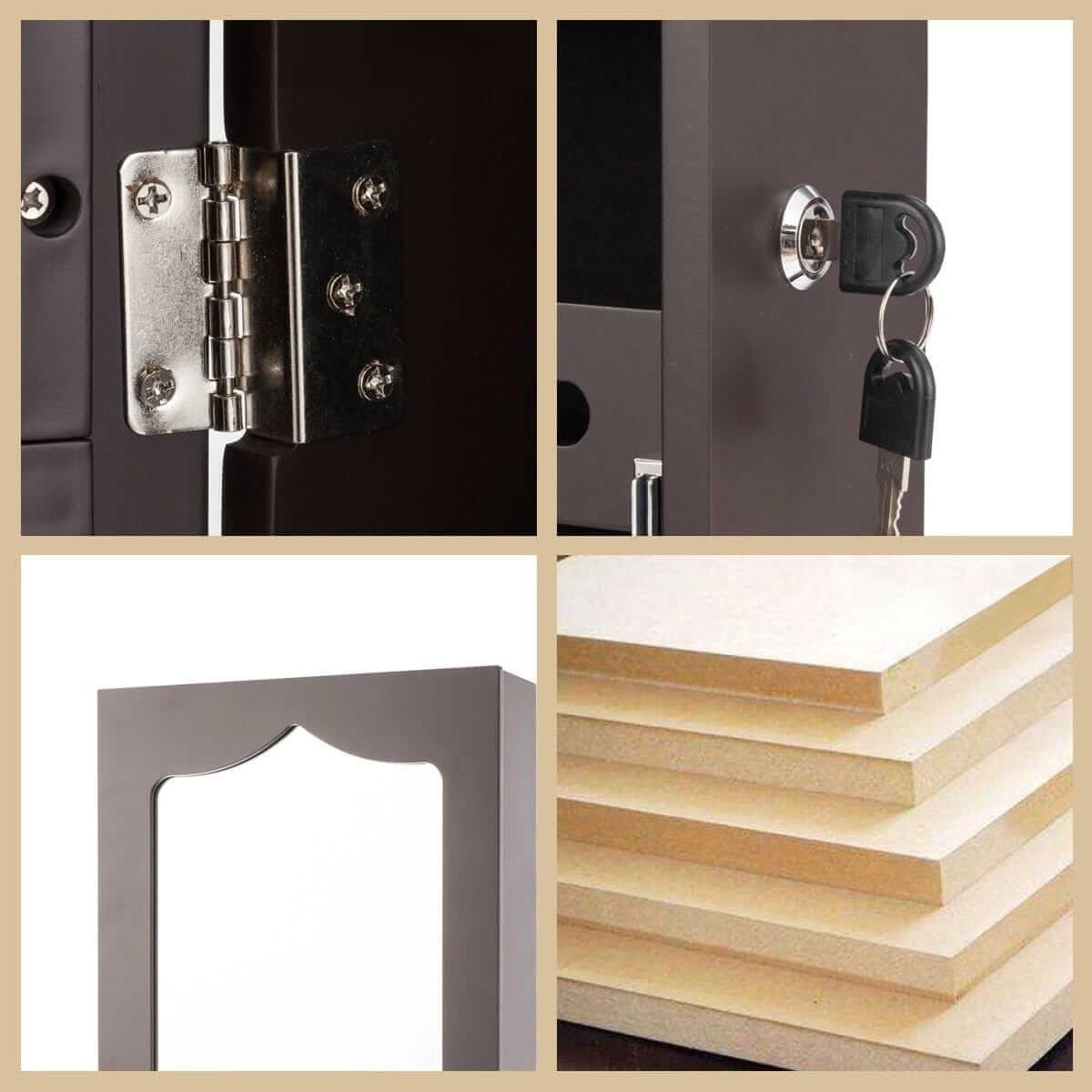 Moisture and corrosion-resistant coating - the cabinet is made of high-quality MDF, so it is extremely strong and durable. The powder coating of the surface is resistant to moisture and corrosion. In addition, the jewelry cabinet's protective velvet lining protects it from scratches and scuffs, as well as oxidation.