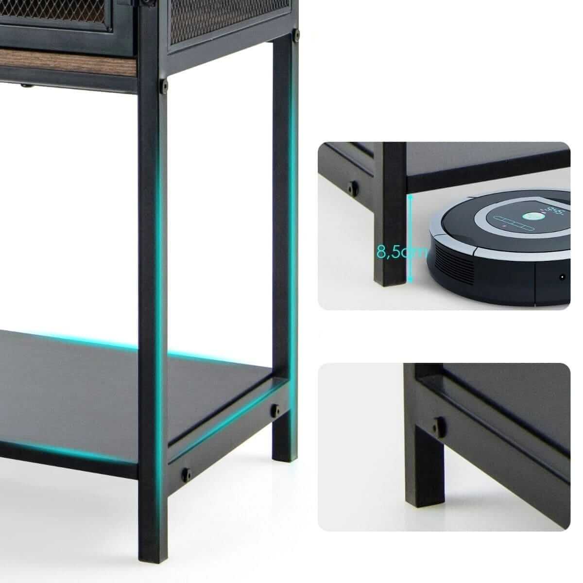 Looking for a nice table for your living room? Our model will be a great choice! Non-slip feet on the legs increase stability and prevent floor scratches. It has two metal mesh cabinets, two drawers and a spacious top where you can store things and display decorations. The whole unit will look great in the living room, hallway or office.