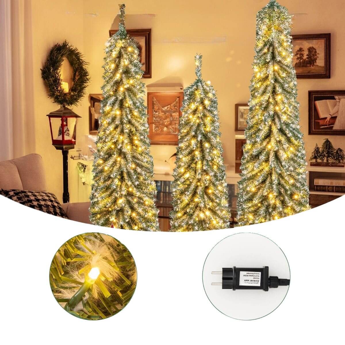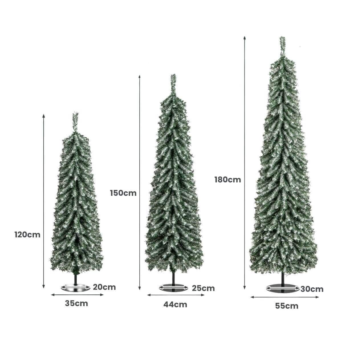Rinkinį sudaro trys skirtingų aukščių eglutės – 120 cm, 150 cm ir 180 cm, kurios puikiai tinka bet kuriai patalpai. Dėl plonos formos šios eglutės idealiai tiks net ir mažose erdvėse, suteikiant Kalėdų dvasios.
