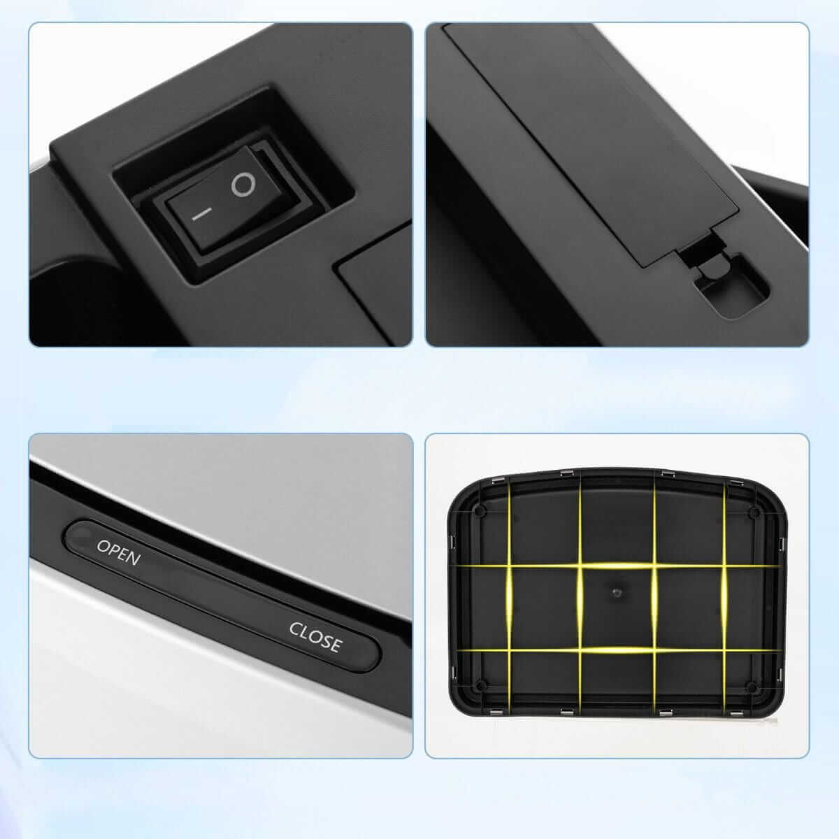 Patogus naudojimas: Be automatinio jutiklio funkcijos, šiukšliadėžę galima valdyti ir mygtukais, o veikimui reikalingos 4 AA baterijos (neįeina į komplektą). Ją patogu naudoti dėl paprasto maitinimo valdymo.