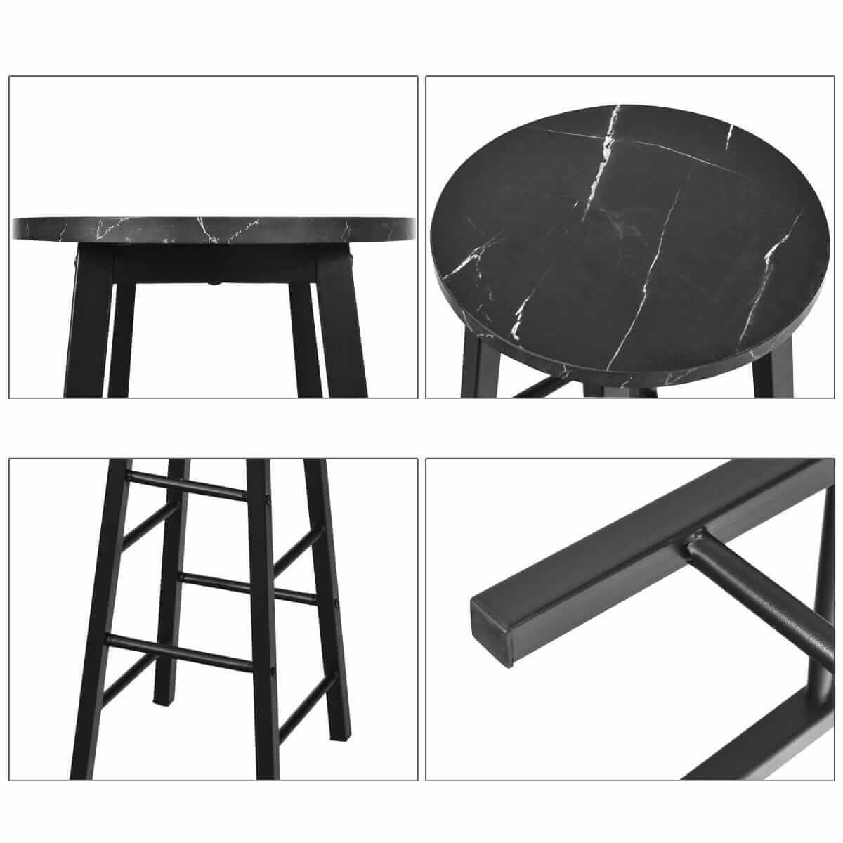 Šis 2 kėdžių rinkinys atitiks jūsų lūkesčius – nuo elegantiškos išvaizdos iki patogumo! Sėdynė pagaminta iš aukštos kokybės medžio drožlių plokštės, yra patvari ir tvirta. 4 pusių atrama kojoms ne tik palaiko pėdas, bet ir atlieka kėdžių sutvirtinimo funkciją. Storas metalinis rėmas yra pakankamai tvirtas, kad išlaikytų didelį svorį. Dėl unikalaus marmuro imitacijos ir juodo rėmo derinio taburetės puikiai atrodys šalia namų virtuvės salelės, restorane, bare ar kavinėje.