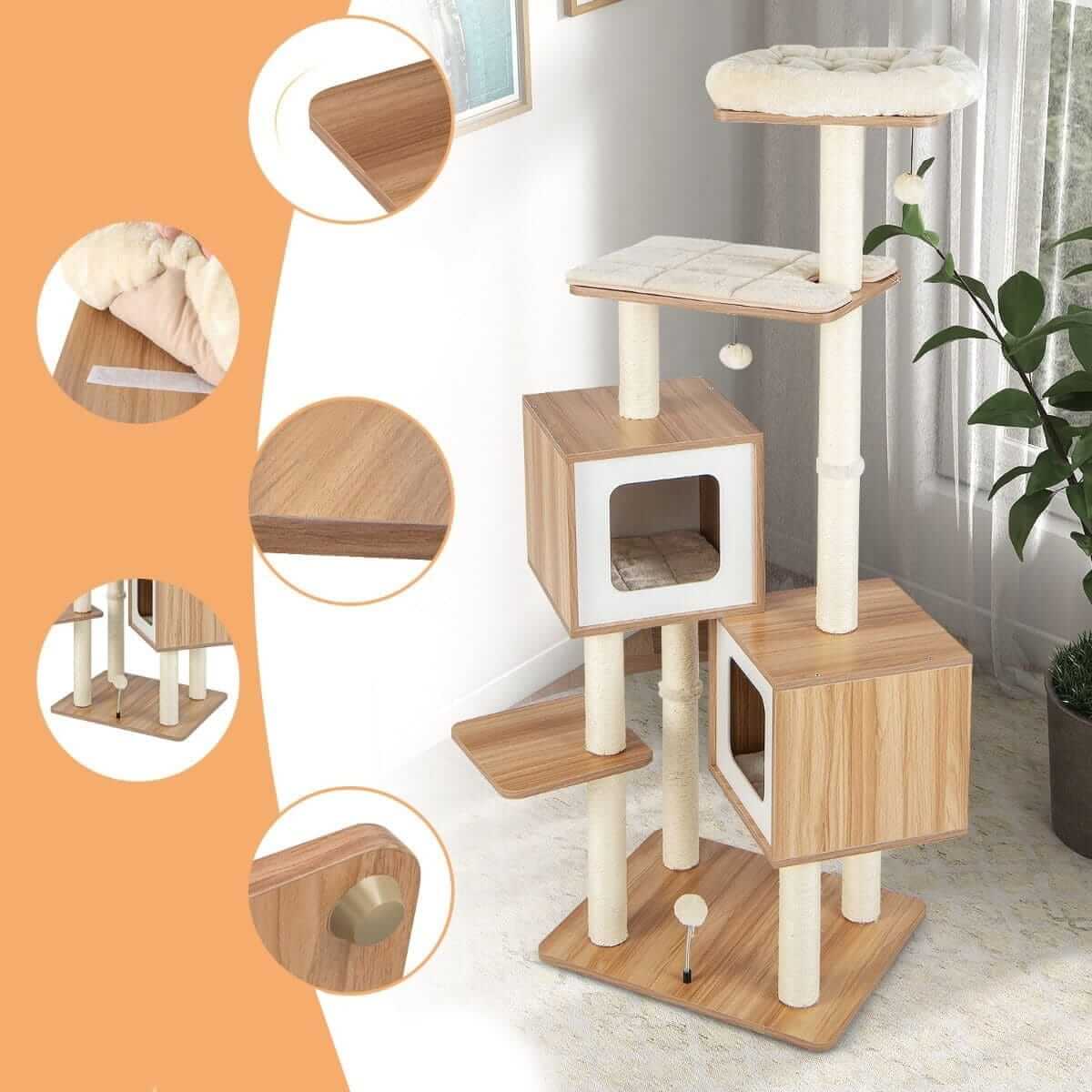 Šio kačių namelio konstrukcija yra tvirta ir patikima, nes jame naudojamos 15 mm storio MDF plokštės, o ne plonos 12 mm plokštės. Kiekvienas sluoksnis gali išlaikyti iki 15 kg apkrovą. Kiekvieną katės būstą palaiko du tvirti stulpai, užtikrinantys išskirtinį stabilumą.