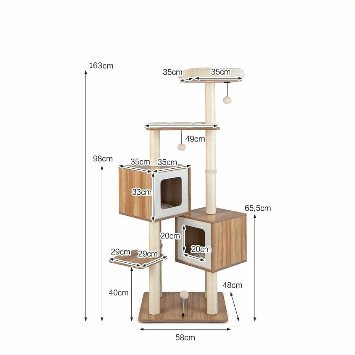 163 cm aukščio kačių draskyklė yra ideali vieta jūsų katei ilsėtis, snausti ir šokinėti. Ant viršutinės platformos, kurioje yra minkšta veltinio pagalvėlė, jūsų katė gali atsipalaiduoti stebėdama, kas vyksta kambaryje. Du didžiuliai žaidimų nameliai sukuria saugumo jausmą. Trys dūzgiantys kamuoliukai suteikia pramogą, o ant daugybės sizalio draskyklių katės gali patobulinti savo nagus. Ji pagaminta iš storintų MDF plokščių ir paremta tvirtomis atramomis, todėl yra patvari ir ilgaamžė. Pagalvėlės taip pat yra lengvai nuimamos ir skalbiamos, o tai padidina patogumą.