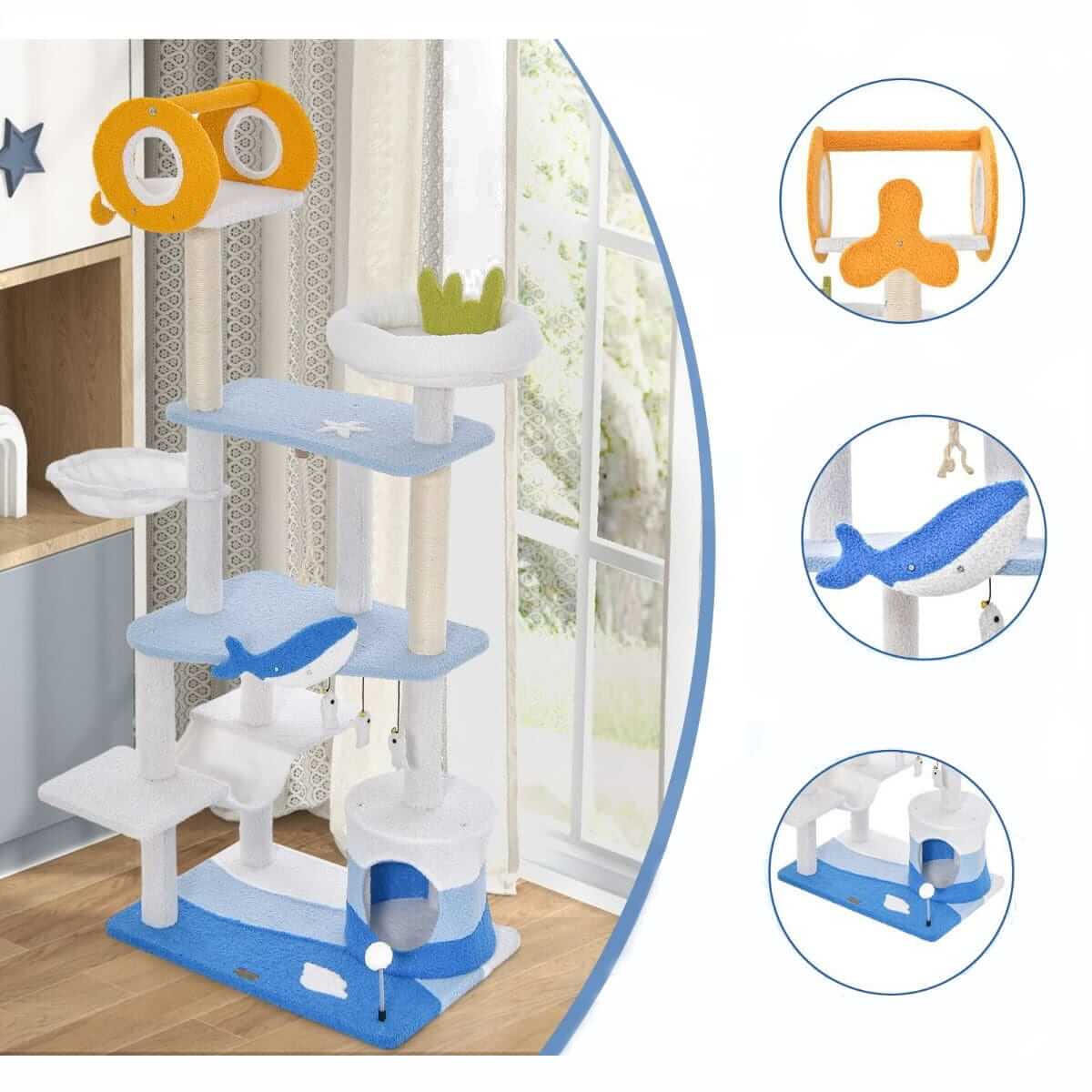 Įsileiskite vandenyną į savo namus su aukštu draskytuvu, kuris primena miniatiūrinį vandenyno rojų su vandenyno bangas imituojančiu pagrindu. Integruota gražios žuvies formos dekoracija, jūros dumblių ornamentai ir povandeninio stiliaus platforma sukuria patrauklią išvaizdą ir paverčia ją dėmesio centru jūsų namuose.