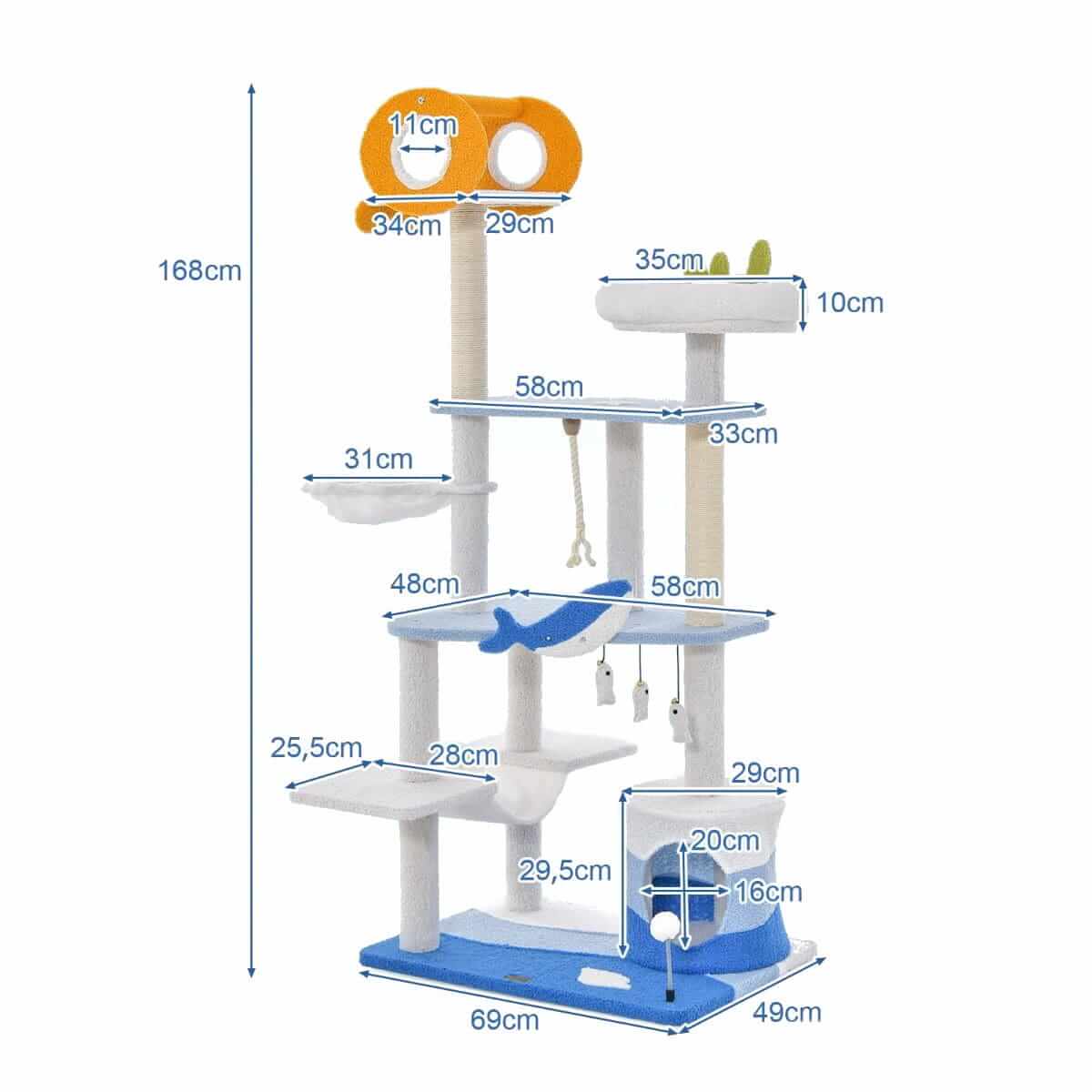 Mūsų draskyklė - tai jaukus prieglobstis katėms ir puikus jūsų namų priedas! Dėl patrauklaus dizaino mūsų daugiapakopis draskymo stovas taps jūsų namų centru. Jo dizainą sudaro bangos, jūrų žvaigždės, kriauklės ir kitos dekoracijos ant kelių platformų. Ant sėdynės su jūros dumblių ornamentu katės gali jaukiai snausti. Taip pat yra daugybė vietų, kuriose galima atsipalaiduoti, todėl šis draskytuvas yra puiki alternatyva daug kačių auginantiems namų ūkiams. Katės gali atsipalaiduoti saulėje ant plataus gulto. Gilus hamakas ir patogus namas suteikia idealią pastogę. Kelios platformos leidžia katėms lengvai užlipti ir nulipti. Be to, tvirti draskytuvai puikiai tinka nagams ilsinti ir baldams apsaugoti. Katės mėgsta įvairius įdomius ir įtraukiančius žaislus, įskaitant sizalio virves ir žaidimų kamuoliukus. Kad katėms būtų šilta, laipiojimo bokštelis apvilktas minkštu pliušiniu flizelinu. Jis turi platų pagrindą, užtikrinantį stabilumą, ir suapvalintus kampus, kad nesusižeistų.
