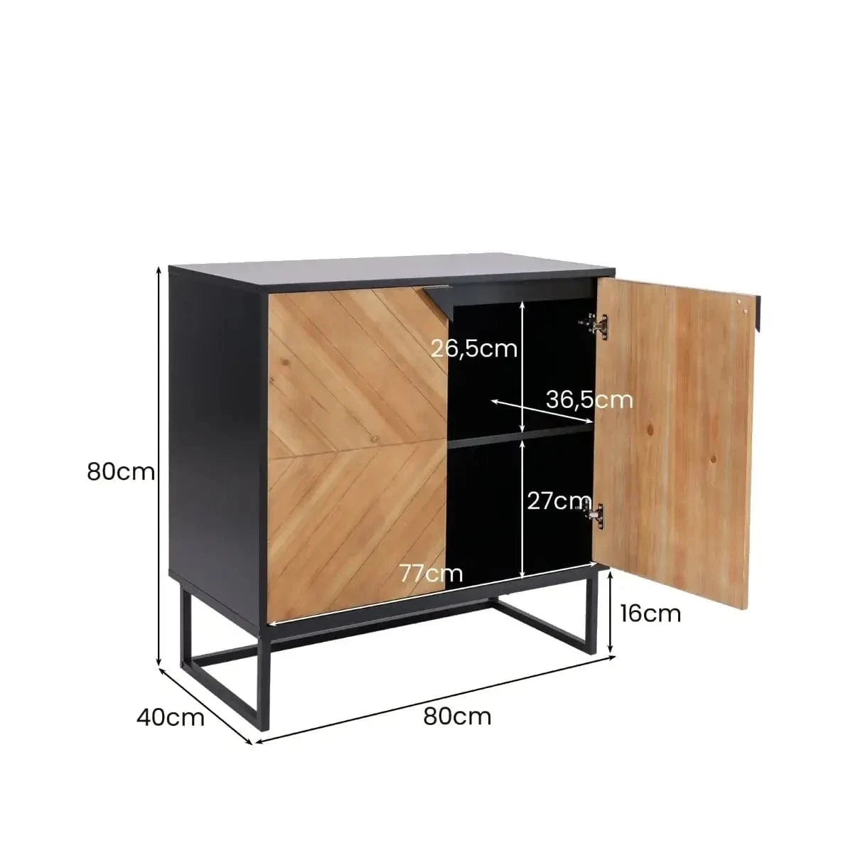 Ieškote baldo, kuris vienu metu būtų ir elegantiškas, ir praktiškas? Ši dviejų durų komoda juodos spalvos su natūraliu medienos akcentu – puikus pasirinkimas. Erdvus stalviršis leidžia eksponuoti dekoracijas ar laikyti reikalingus daiktus, o du talpūs vidiniai skyriai suteikia daug vietos virtuvės reikmenims, knygoms ar aksesuarams.