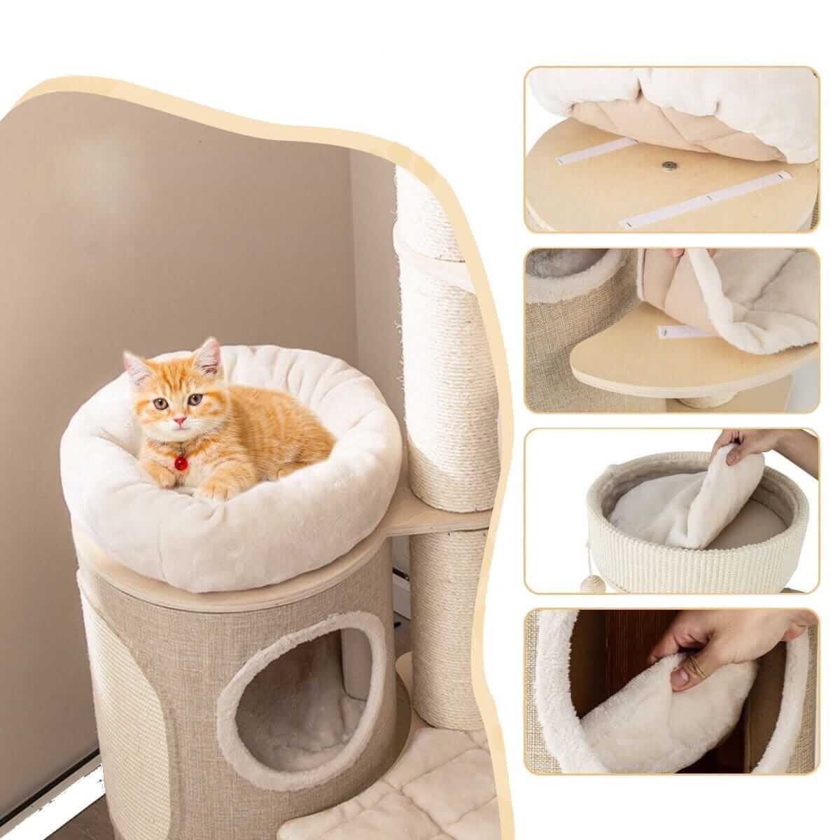 Nuimamos pagalvėlės ir minkšta pliušinė lova užtikrina, kad bokštą būtų lengva prižiūrėti. Visas medžiagas galima plauti skalbimo mašinoje, todėl švaros palaikymas tampa paprastas ir greitas.