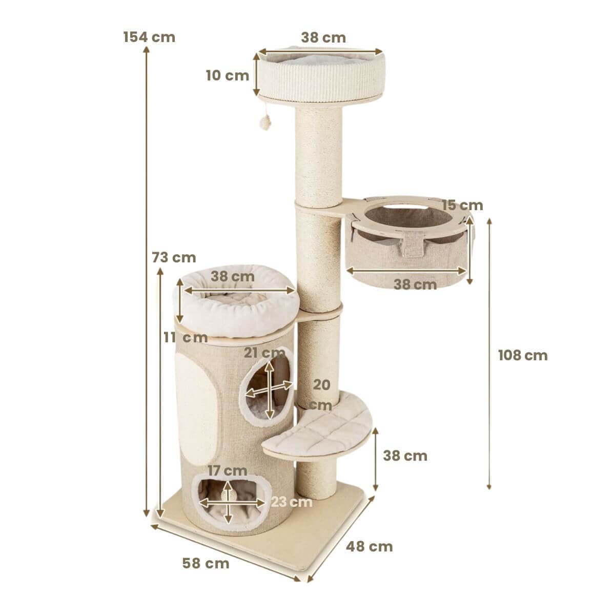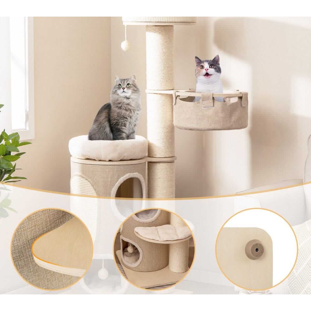 Šis daugiafunkcinis kačių bokštas yra idealus sprendimas tiek vienai, tiek kelioms katėms. Jis sujungia žaidimų, poilsio ir draskymo funkcijas, suteikdamas jūsų augintinėms erdvę atsipalaiduoti ir žaisti. Bokšte yra viršutinis ešerys, jaukus hamakas, nuimama lova ir erdvus 2 aukštų namelis, puikiai tinkantis katėms stebėti aplinką ir pailsėti.