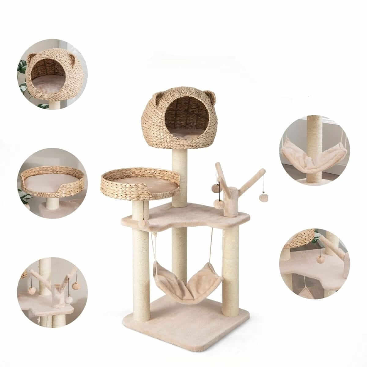 Daugiafunkcinis: veiklos centras suteiks galimybę tyrinėti, ilsėtis, žaisti ir atsipalaiduoti. Katės gali ilsėtis ant minkšto gulto arba slėptuvėje, žaisti su keturiais žaismingais kailio kamuoliukais, atsipalaiduoti ir snausti jaukiame hamake arba šokinėti aukštyn ir žemyn nuo didelės platformos.