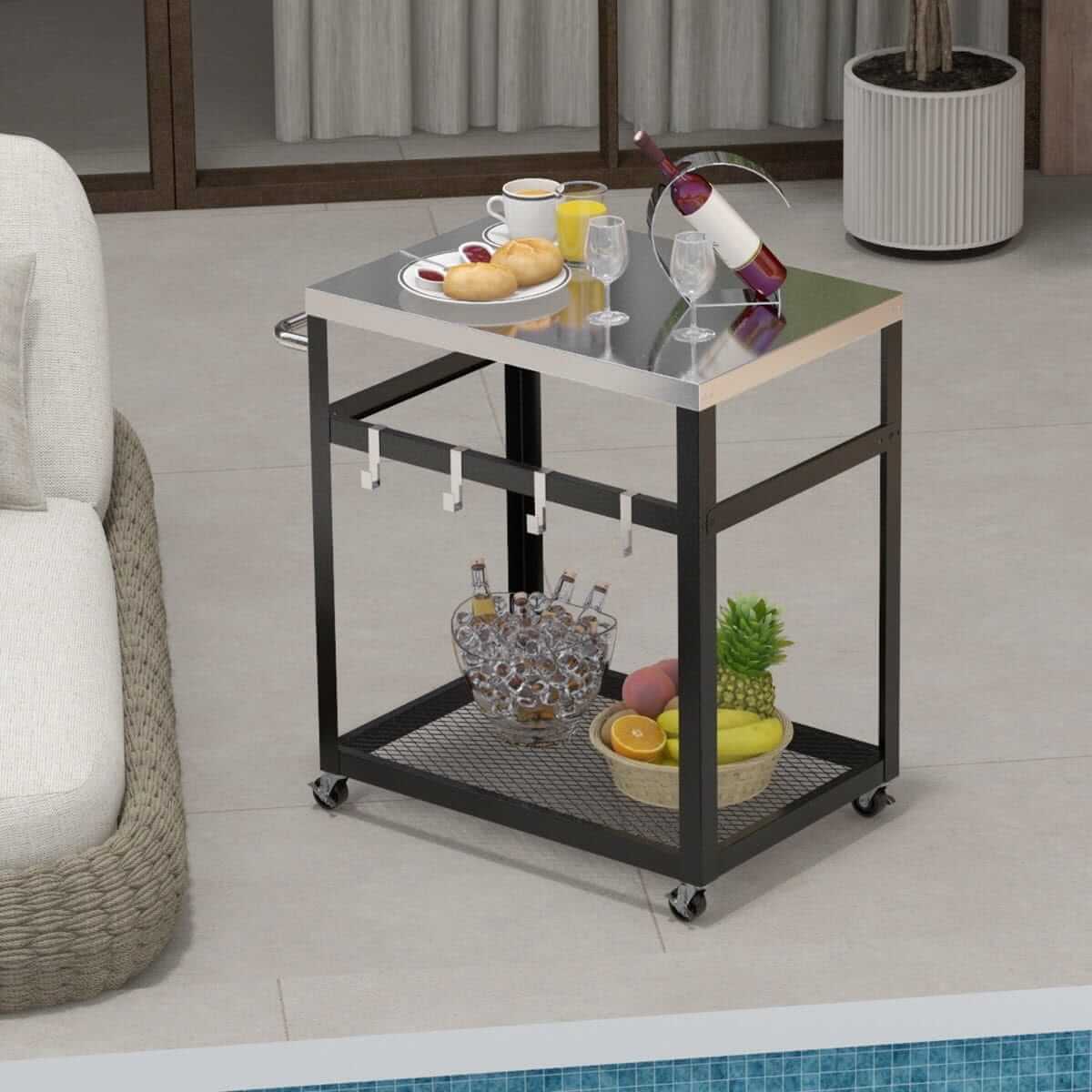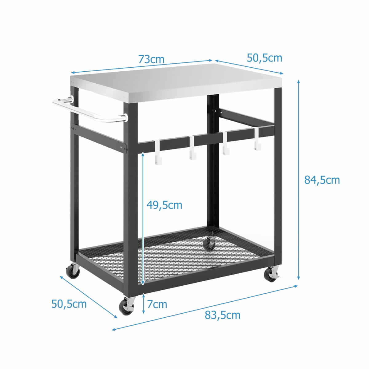 Tinka įvairioms užduotims atlikti: Šis puikus baldas neabejotinai gali atitikti įvairius reikalavimus. Jis gali būti naudojamas kaip mobilus maisto ruošimo stalas, kepsninės vežimėlis, papildomas sodinimo stalas ar darbo vieta arba virtuvinis stovas mikrobangų krosnelei ar orkaitei.