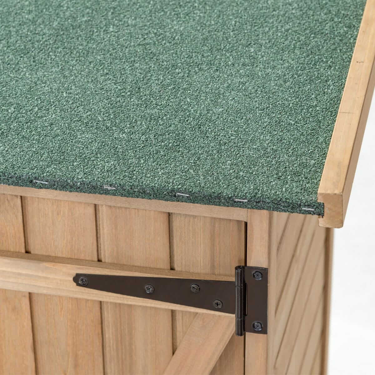 Vandeniui atsparus šlaitinis asfaltinis stogas: šios įrankių spintelės asfaltinis stogas yra atsparus vandeniui, todėl puikiai tinka naudoti lauke. Be to, šlaitinis stogas leidžia greitai nubėgti lietui ir neleidžia kauptis vandeniui. Tvirtos atramos yra pakeltos, kad daiktai nepatektų į šlapią žemę.