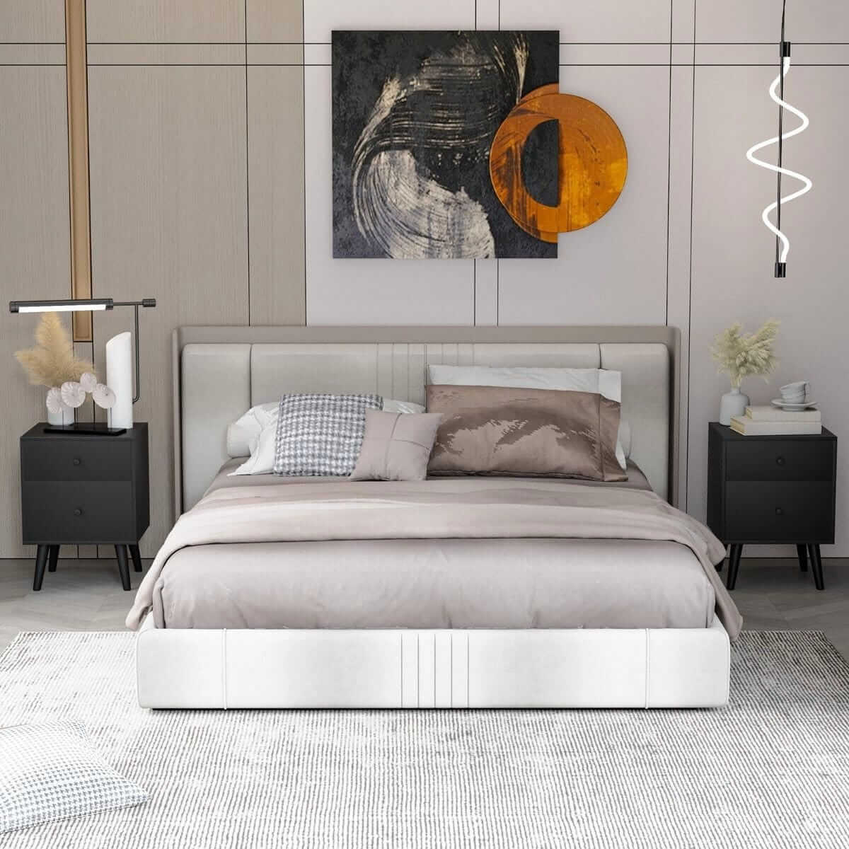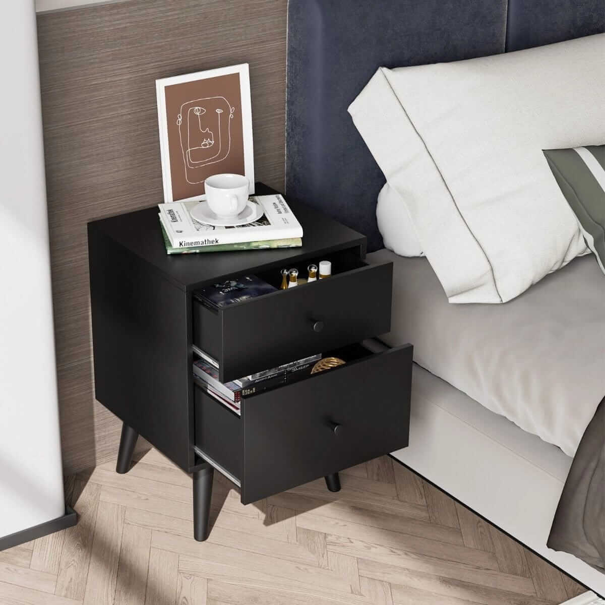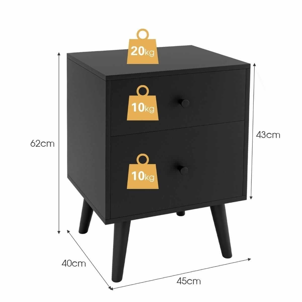 Tvirta konstrukcija ir medinės kojos: Mūsų 2 stalčių spintelė pagaminta iš aukštos kokybės medienos drožlių plokštės ir MDF, todėl yra itin tvirta ir tvirta. Keturios gummedžio kojos užtikrina tvirtą ir saugią platformą.