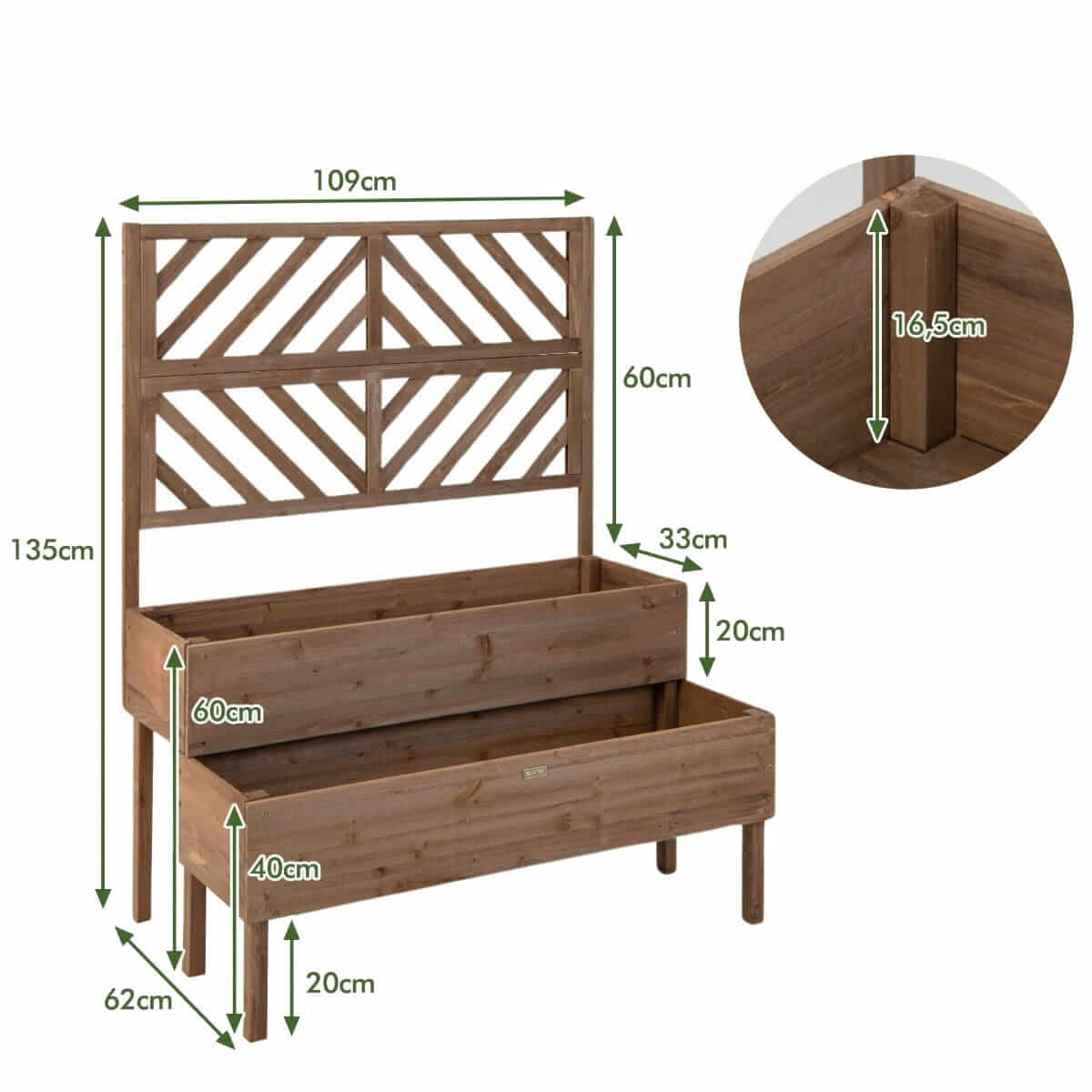 Vazonėlyje yra dvi didelės sodinimo dėžės (kiekviena 109 x 33 x 20 cm) ir praktiškos grotelės vijokliniams augalams. Čia galėsite auginti gėles, daržoves, žoleles ar net dekoratyvinius krepšelius.