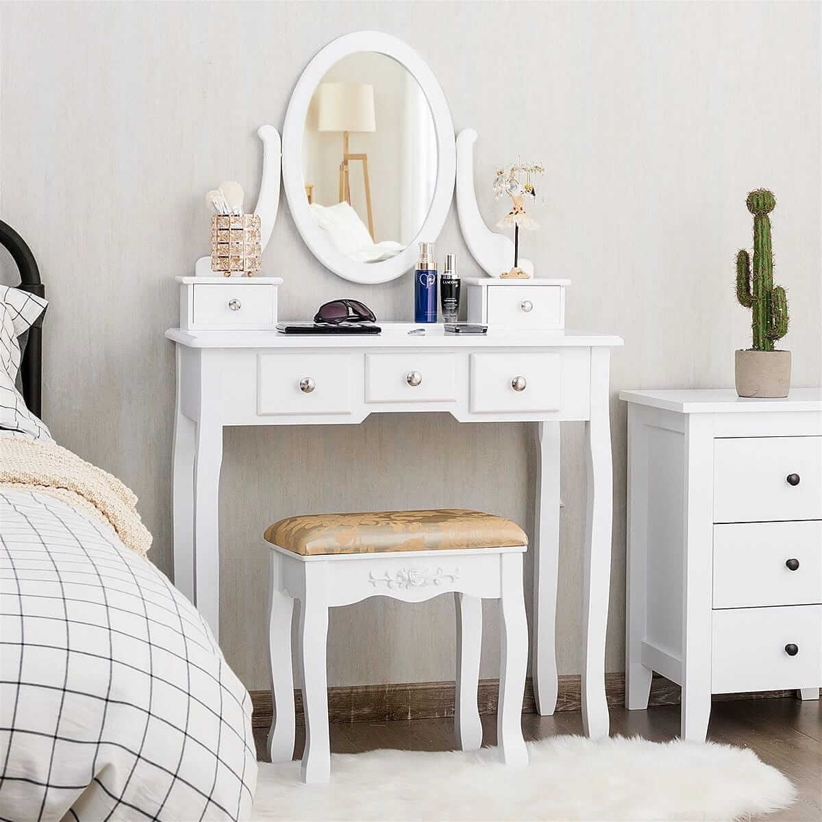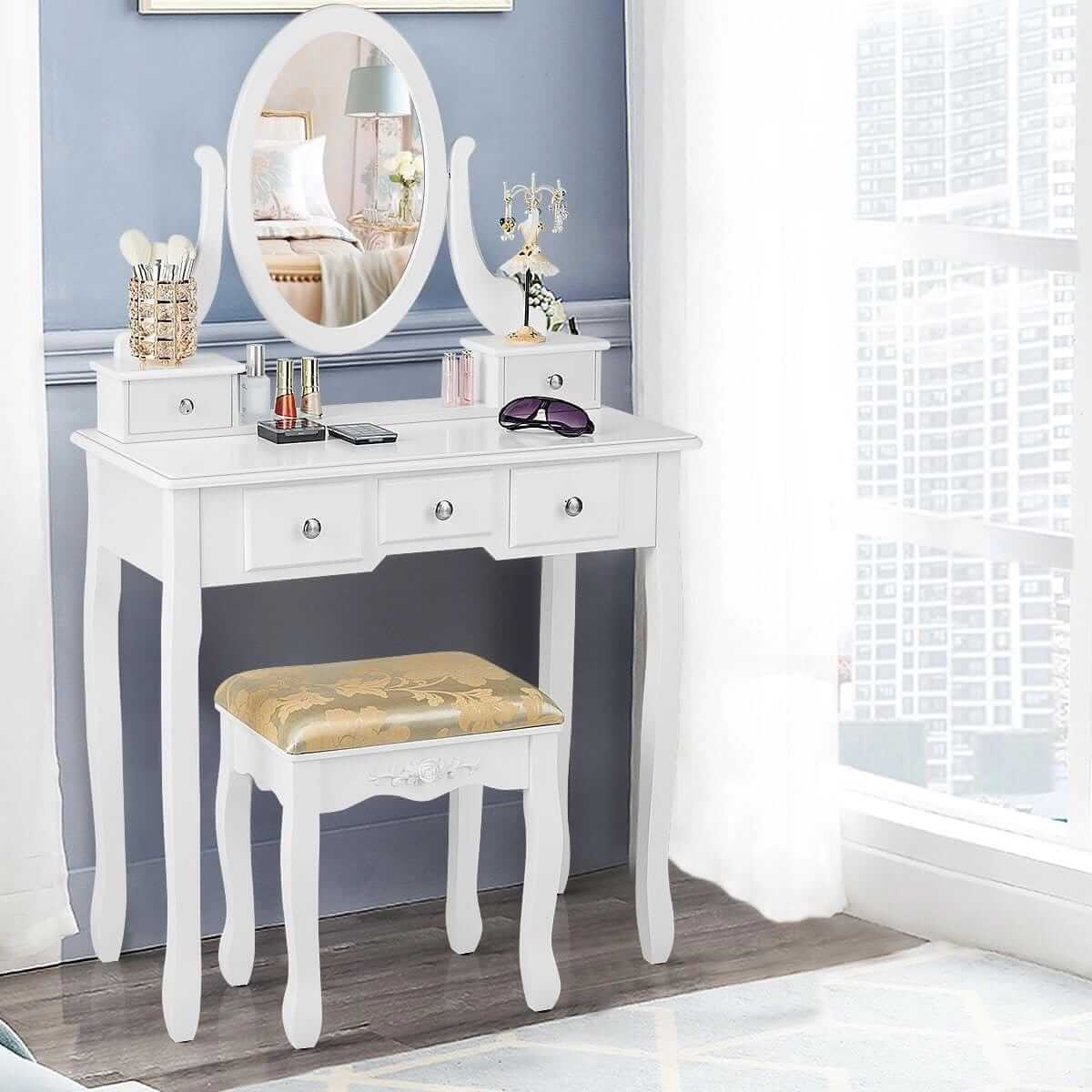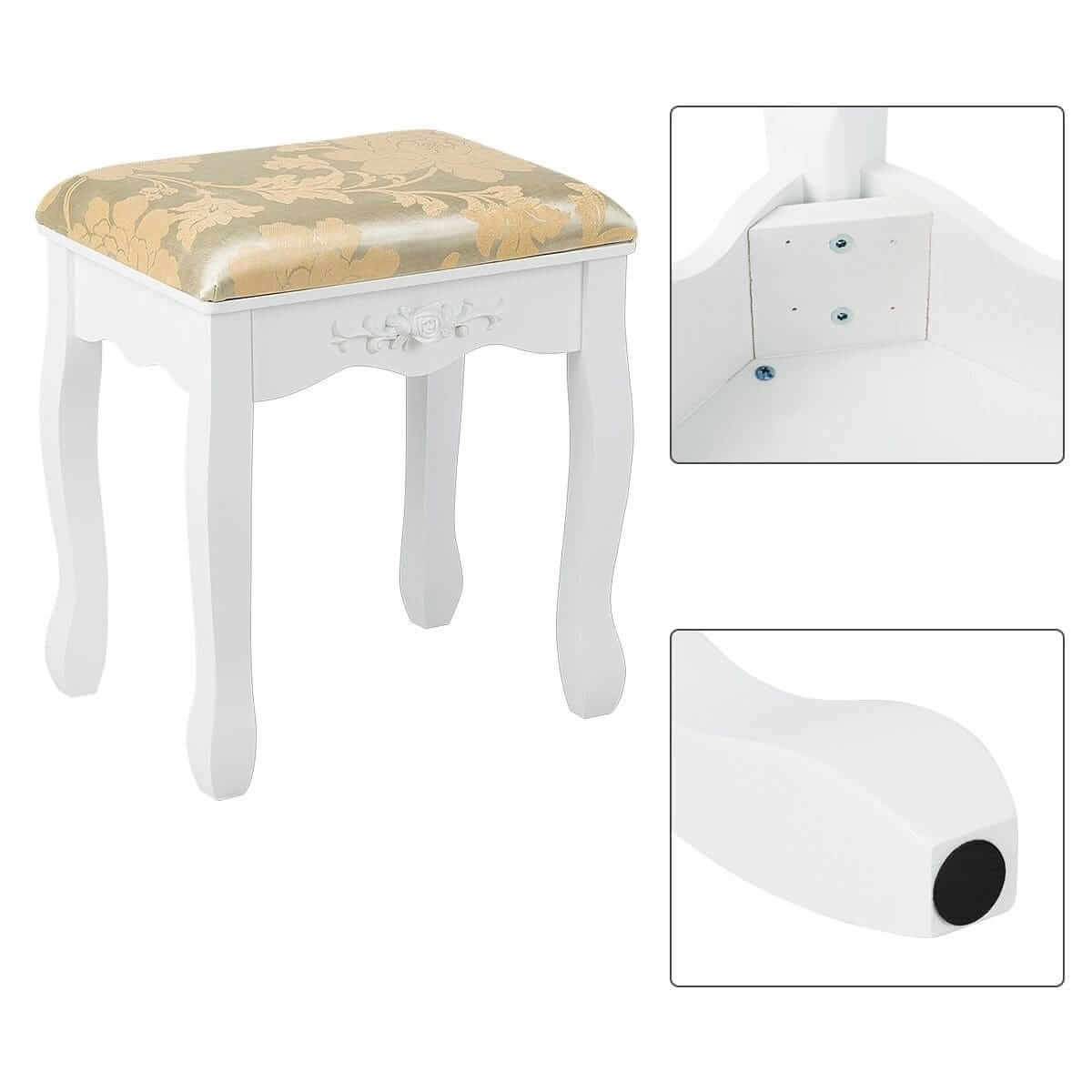 Balta minkšta taburetė, medinis tualetinis staliukas su pasukamu veidrodžiu