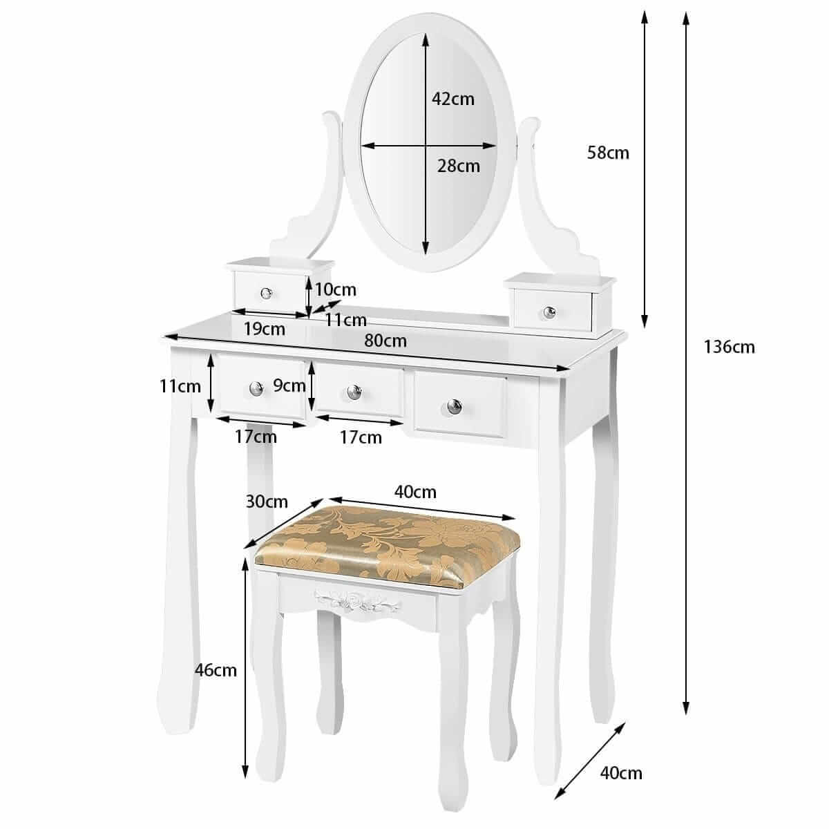 Mūsų tualetinis staliukas su veidrodžiu pagamintas iš MDF ir paulovnijos medienos, kuri užtikrina puikų stabilumą ir ilgaamžiškumą. Veidrodis gali suktis 360° kampu, todėl galite jį pastatyti taip, kaip reikia. Tualetinio staliuko stalviršį galima nuimti ir paversti jį rašomuoju stalu mokymuisi ir darbui. Didelis paviršiaus plotas ir 5 dideli stalčiai leidžia lengvai laikyti kosmetiką ir palaikyti tvarką kambaryje. Kiekvienas stalčius turi dekoratyvinį elementą, taip pat apvalią rankenėlę, kad būtų lengva ištraukti. Elegantišku gėlių raštu ir rožių raižiniais šonuose apmušta taburetė yra madinga ir estetiška, ji papildys bet kokio kambario interjerą.