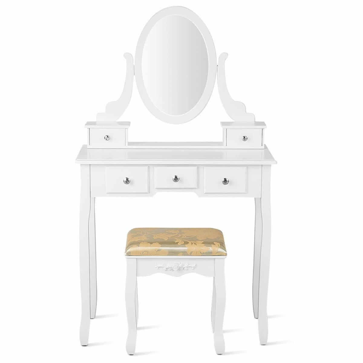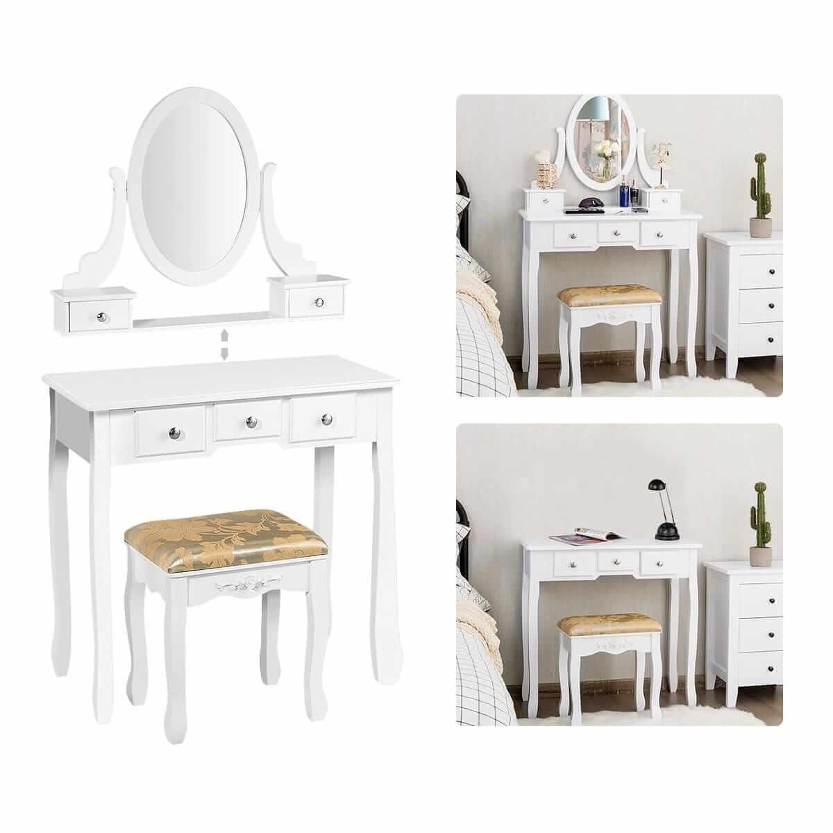 Besisukantis ovalus veidrodis užtikrina aiškų atspindį visais kampais ir turi nuimamą viršų. Stalviršio turinį galima išimti, todėl tualetinį staliuką galima naudoti kaip darbo ir mokymosi stalą.