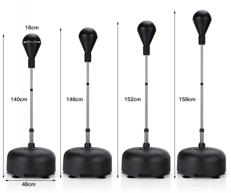 Rinkinio aukštis lengvai reguliuojamas 4 skirtingais lygiais: 140 / 146 / 152 / 158 cm. Tai leidžia patogiai pritaikyti bokso kriaušę prie kiekvieno vartotojo ūgio – nuo vaikų iki suaugusiųjų.