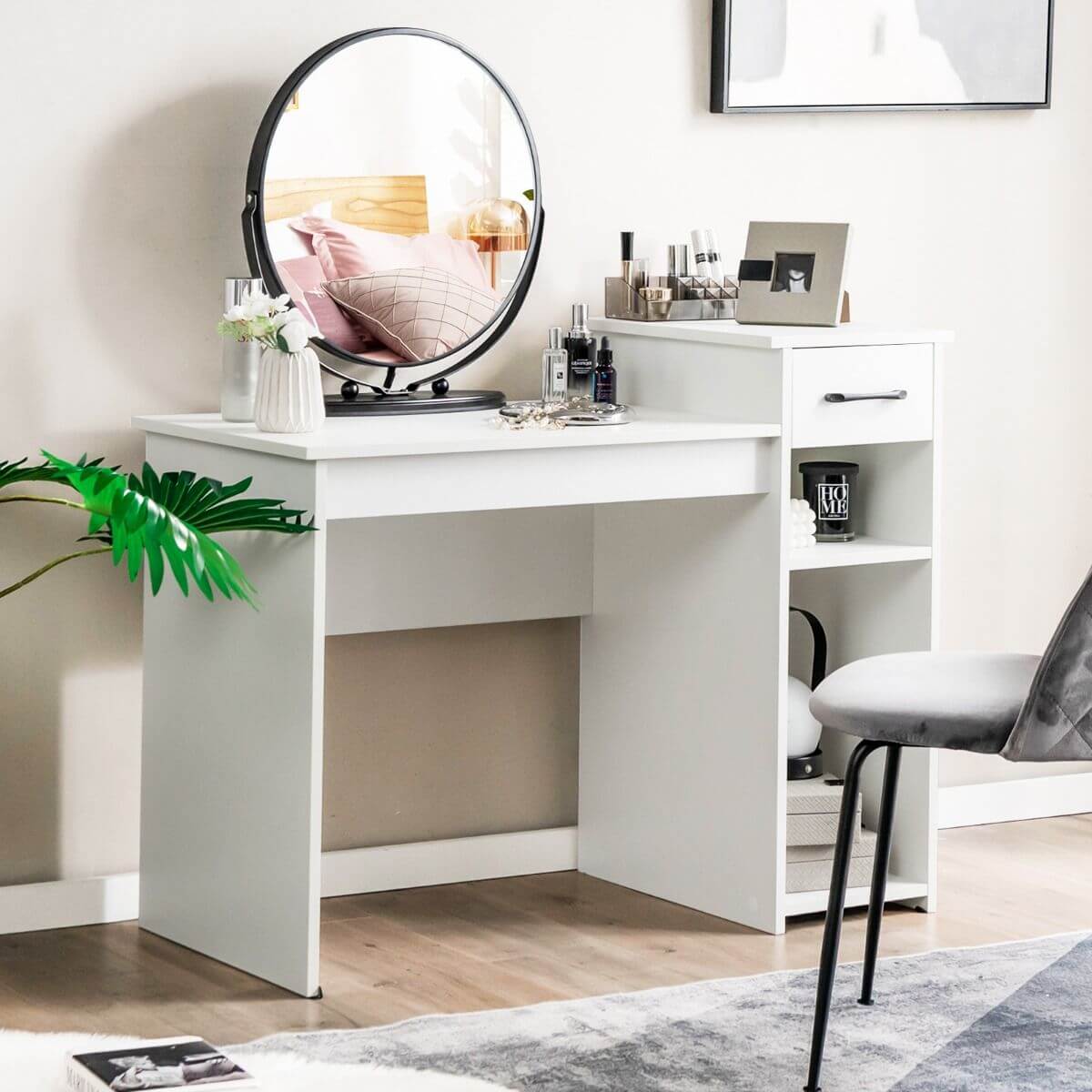 Šis rašomasis stalas su integruota spintelė suteikia pakankamai vietos kasdieniams daiktams, knygoms ar dekoracijoms laikyti. Spintelėje yra dvi lentynos ir stalčius, kurie padeda išlaikyti tvarką darbo vietoje. Stalas yra universalus – puikiai tinka naudoti biuruose, bibliotekose ar net interneto kavinėse.