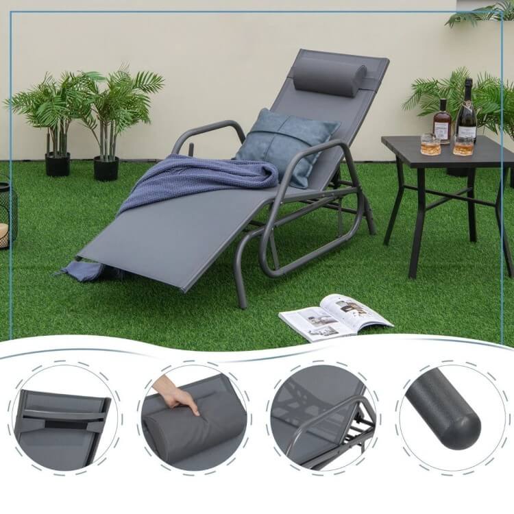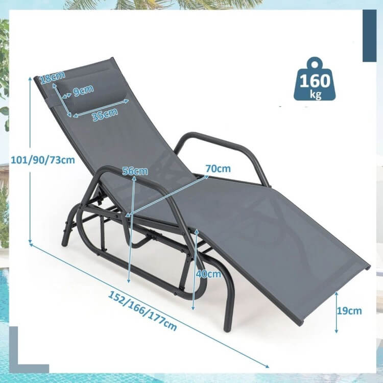 Šezlongas pasižymi milteliniu būdu dengtu metaliniu rėmu, kuris užtikrina atsparumą lauko sąlygoms ir ilgą tarnavimo laiką. Stabili konstrukcija išlaiko iki 160 kg apkrovą, tad poilsis visuomet bus saugus ir komfortiškas.