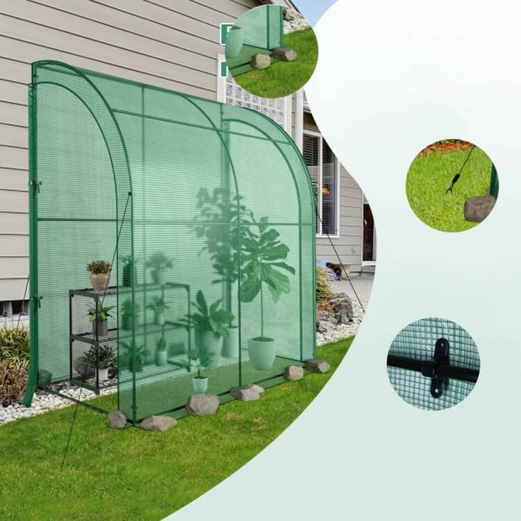 Šiltnamis turi papildomų ilginamų kraštų, kuriuos galima užkasti ar prispausti, bei tvirtinimo prie sienos funkciją, kuri apsaugo nuo siūbavimo ir padidina saugumą net vėjuotomis dienomis.
