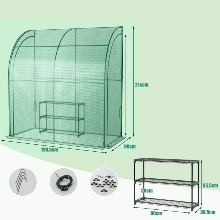 Didelės susukamos durys su dirželiais leidžia patogiai patekti į vidų ir reguliuoti vėdinimą. Kiekviename lentynos lygyje galima pasiekti augalus laistymui ar priežiūrai be jokių nepatogumų.