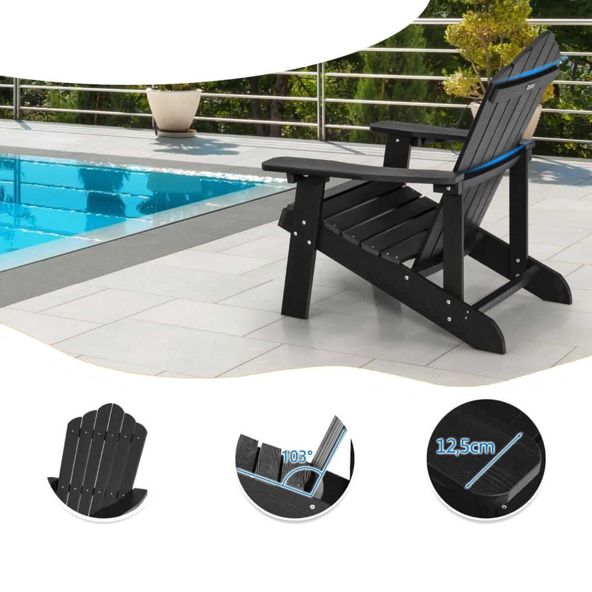 Didesnis stabilumas ir lengvas surinkimas: Naudojant daugybę nerūdijančio plieno varžtų, gulto konstrukcija bus tvirtai sujungta ir užtikrins stabilią atramą 170 kg apkrovai. Adirondack kėdė pateikiama su 8 dalimis ir pilnu varžtų rinkiniu, o dėl išsamių instrukcijų ją galima greitai surinkti vos per 15 minučių.