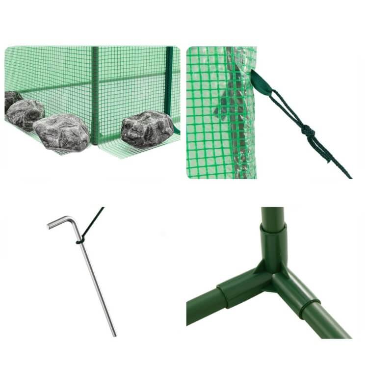 Dėl pailginto dangčio krašto, kurį galima užkasti ar nusverti, bei komplekte esančių lynų ir metalinių kaiščių, šiltnamis išlieka stabilus net esant stipriam vėjui. Tai patikimas sprendimas jūsų augalų apsaugai.