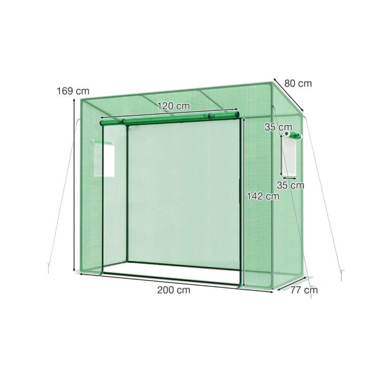 Šiltnamis turi didelį užtraukiamą įėjimą (120x142 cm), leidžiantį patogiai patekti vidun. Dvisluoksniai langai su tinkleliu (35x35 cm) gerina oro cirkuliaciją ir saugo nuo vabzdžių bei smulkių gyvūnų.