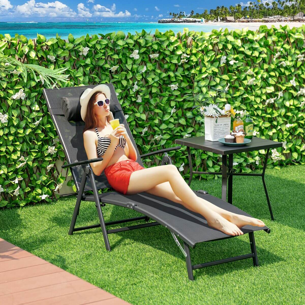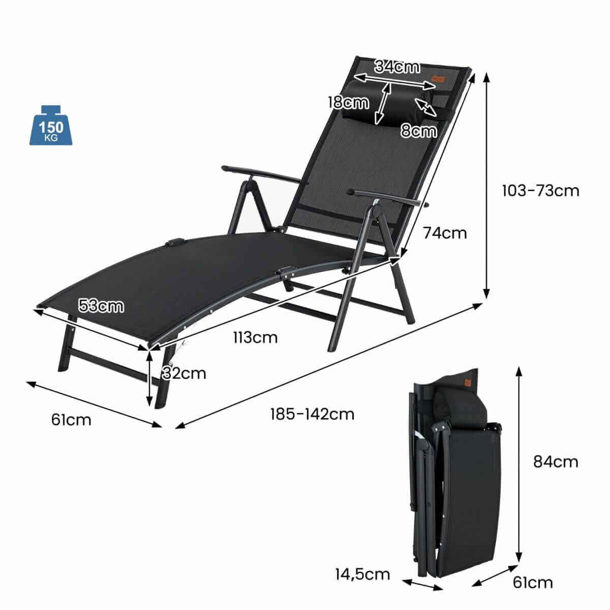 Mūsų sulankstoma poilsio kėdė idealiai tinka mėgstantiems atsipalaiduoti lauke! Patogaus dizaino kėdėje yra vėdinamas atlošas ir minkšta galvos pagalvėlė jaukiam poilsiui, o atlošą galima reguliuoti septyniais skirtingais būdais. Be to, metalinė konstrukcija yra atspari korozijai ir gali išlaikyti iki 150 kg svorį. Dėl paprastos sulankstomos gaminio formos jį lengva laikyti, kai nenaudojamas. Mūsų kiemo kėdė idealiai tinka tiems, kurie mėgsta ilsėtis lauke.