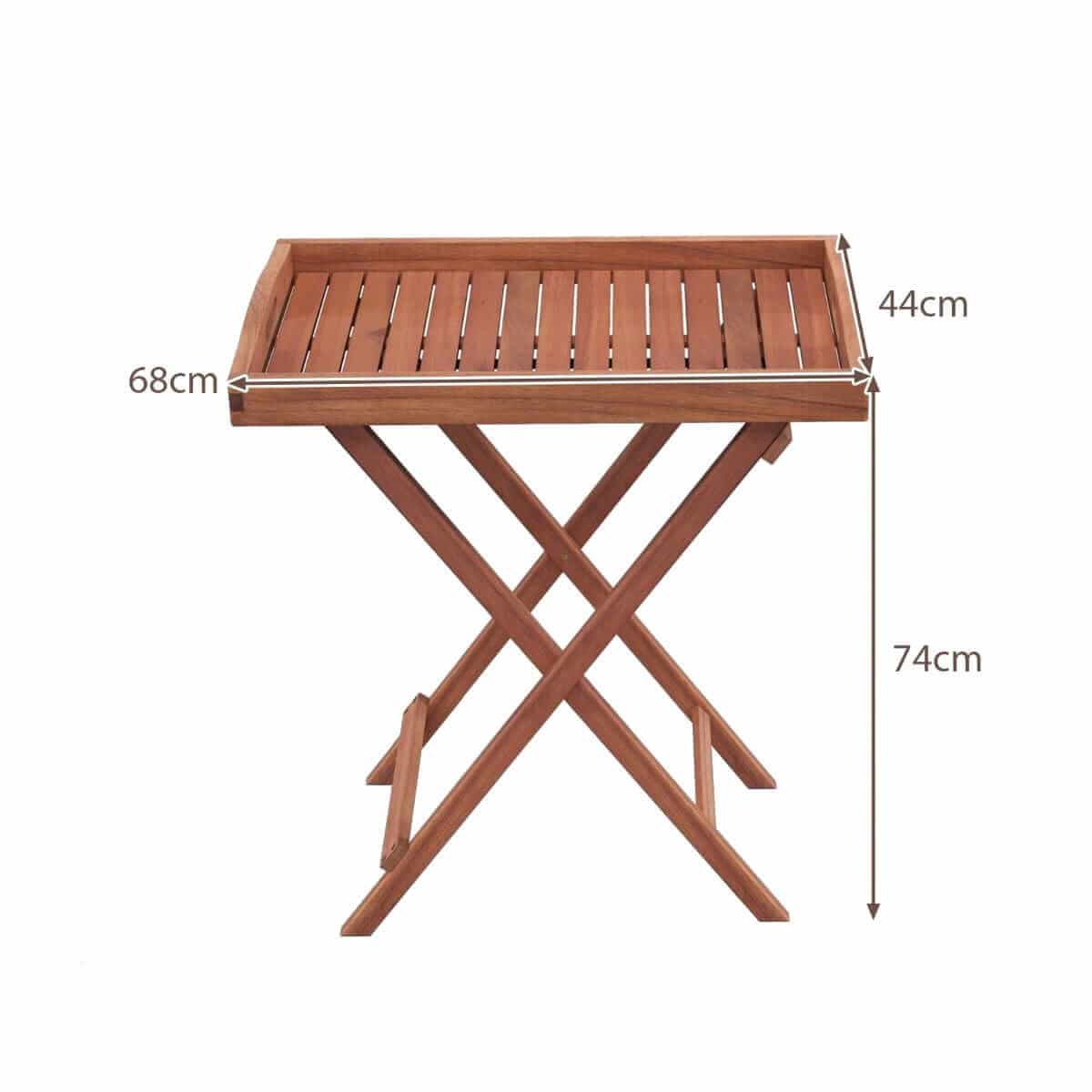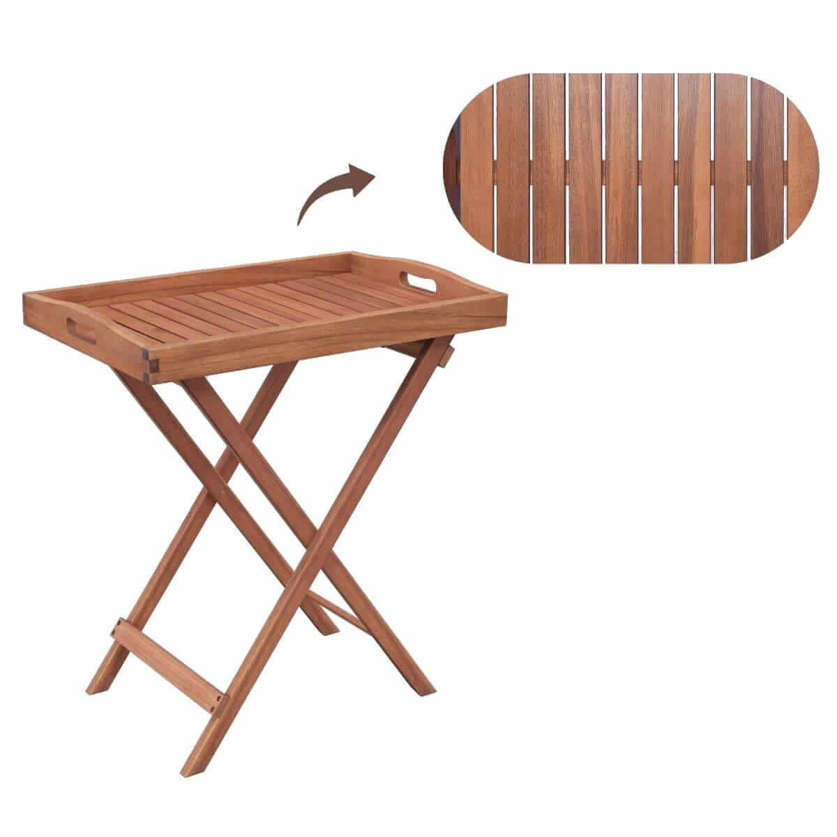 Sulankstomas ir erdvę taupantis dizainas: Šis nešiojamasis stalas gali būti lengvai sulankstytas ir gabenamas į skirtingas vietas, nes tai puikus vietos taupymo sprendimas. Be to, ant sodo stalo yra padėklas, kurį galima lengvai nuimti ir naudoti atskirai kaip nešiojamą padėklą.