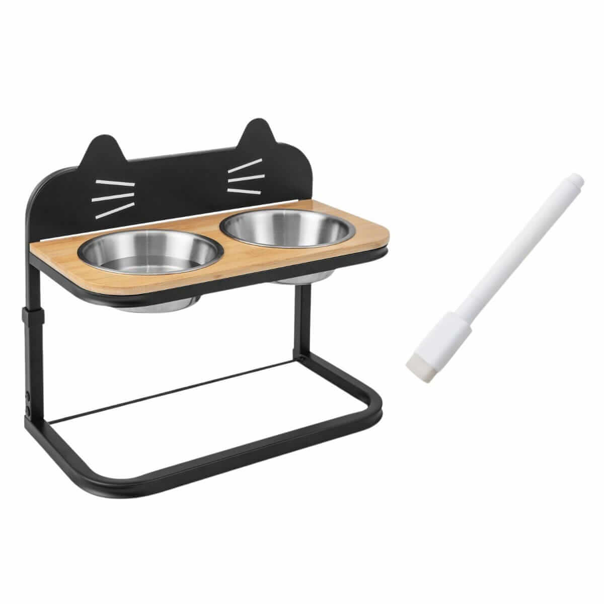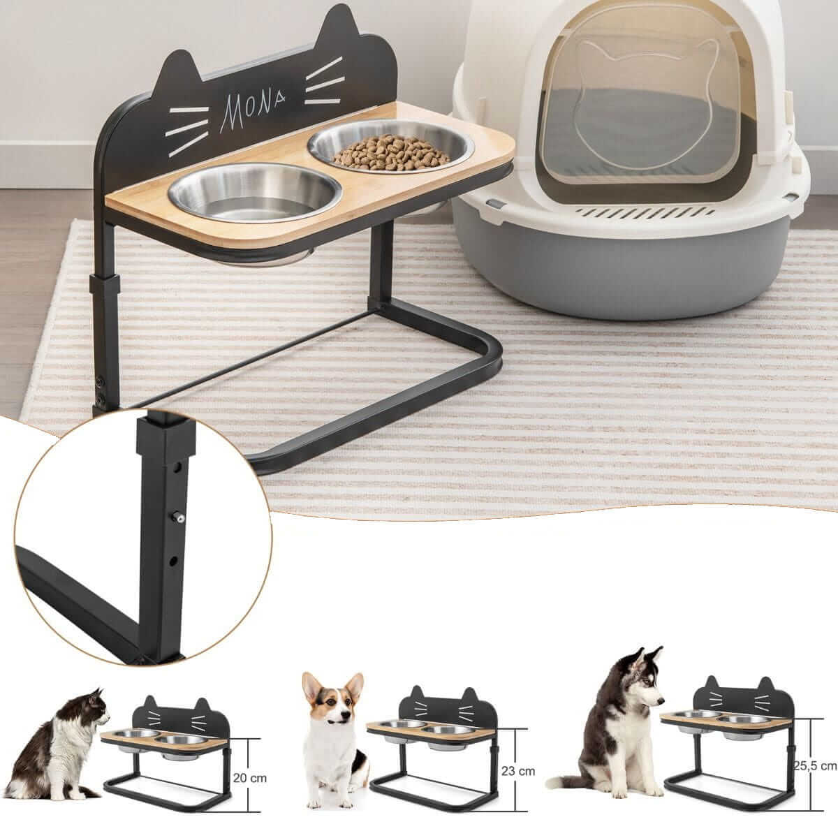 Du dubenėliai ant šio patrauklaus ir naudingo stovo patenkins jūsų poreikius, o svarbiausia - jūsų augintinio. Ilgus saugaus naudojimo metus užtikrina tvirtas milteliniu būdu dengtas plieninis stovas, natūralaus bambuko viršus ir higieniški dubenėliai, pagaminti iš aukščiausios kokybės nerūdijančio plieno. Viršūnė yra lengvai reguliuojama, kad atitiktų jūsų augintinio ūgį. Kartu yra miela lentelė, kurią galite personalizuoti pridėtu baltu žymekliu su savo keturkojo bičiulio vardu.